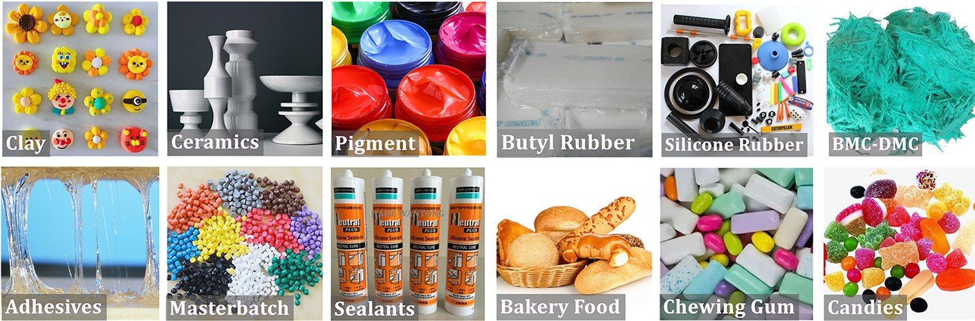 ▪ The sigma/z blade kneader mixer are widely used for high-density sealants, neutral glass glue, acidic glass glue, hot melt,silicone rubber, butyl rubber, rubber, pulp, cellulose, batteries, inks, pigments, dyes, pharmaceuticals, resins, plastics, cosmetics, carbon paste, clay, plasticine, BMC and other chemical products,it can also be used for dough, syrup, chewing gum, bubble gum, chocolate and other food products.